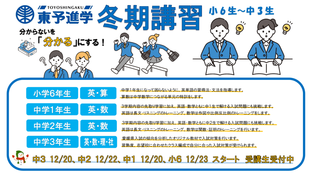 定期テスト対策は5教科対応、高得点を取るための対策授業を行います。 中3生は入試に向けた授業を年間を通して行い、12,1,2月は完全入試対策を行います。